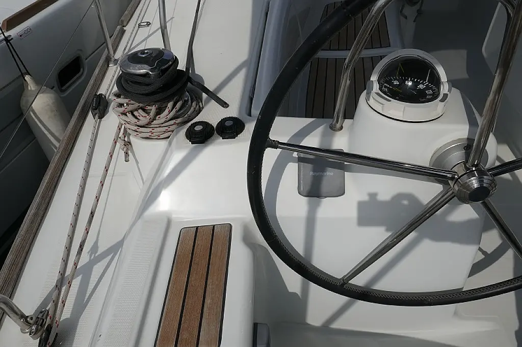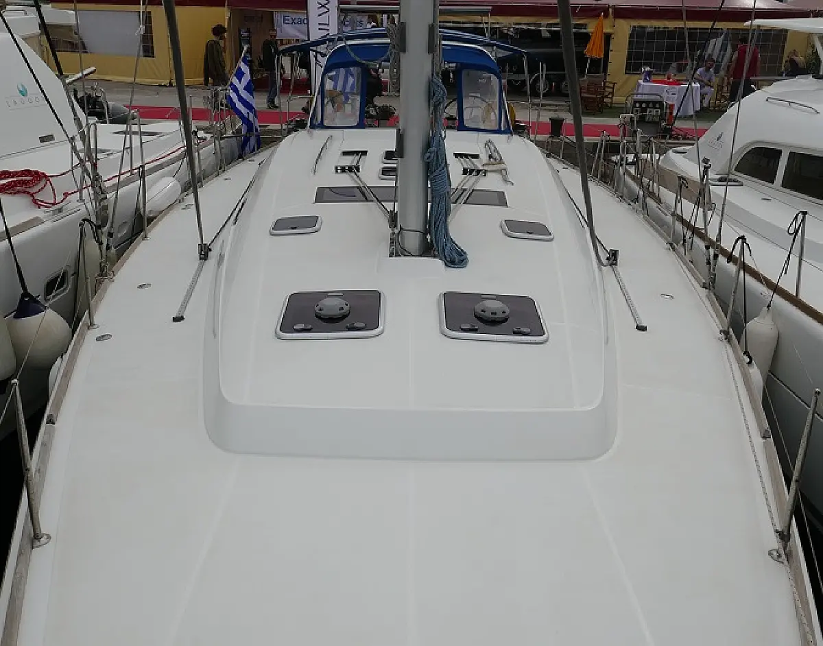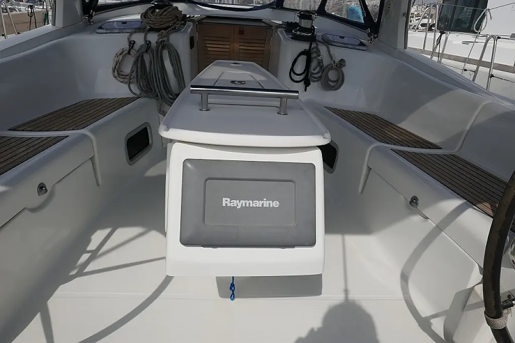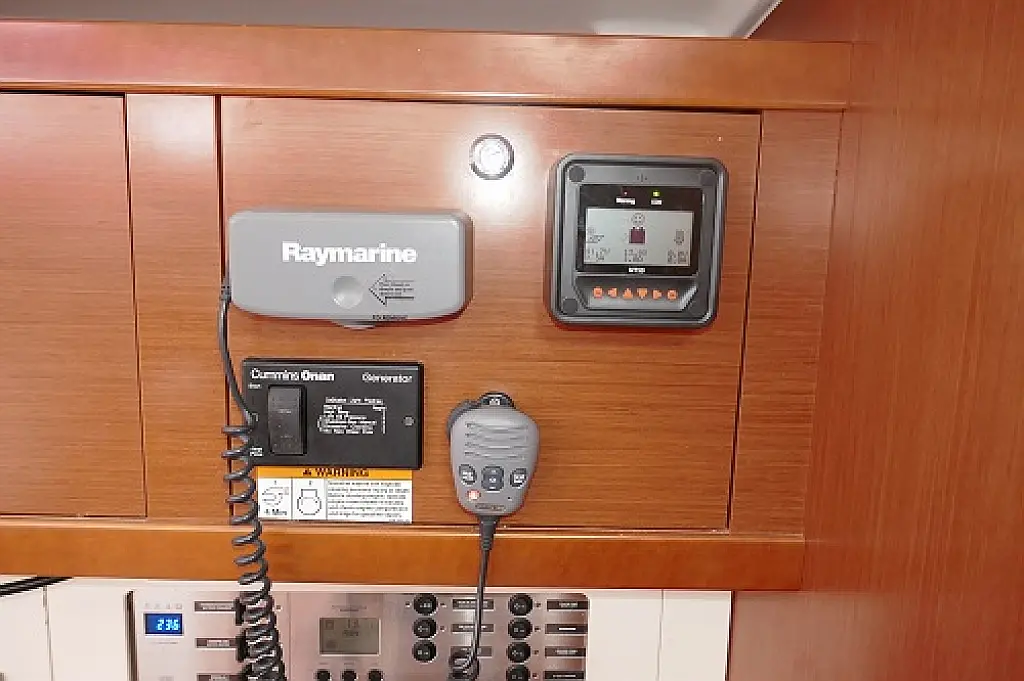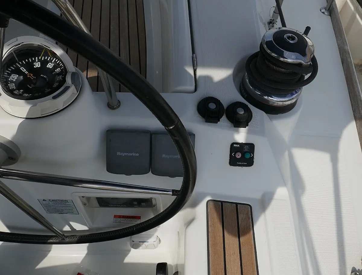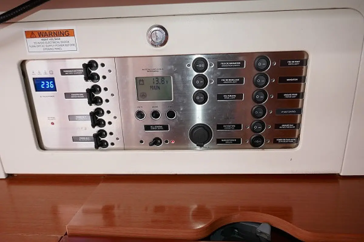 Convertable saloon table, Full batten main sail, Furling genoa, Lazy bag, Solar panels, Electric anchor windlass, Steering wheel (2), Generator, Air condition, Bimini top (Soft), Sprayhood, Electric fridge (2), Ice box, Autopilot, Wind instruments, Echo sounder, Speed log, GPS chartplotter, Battery charger, Inverter, 12 V plug, Electric winch (3), VHF, Bluetooth stereo, Bowthruster, Warm water, TV LED, Dinghy, Cockpit shower, Electric toilets (true), Holding tanks (5)