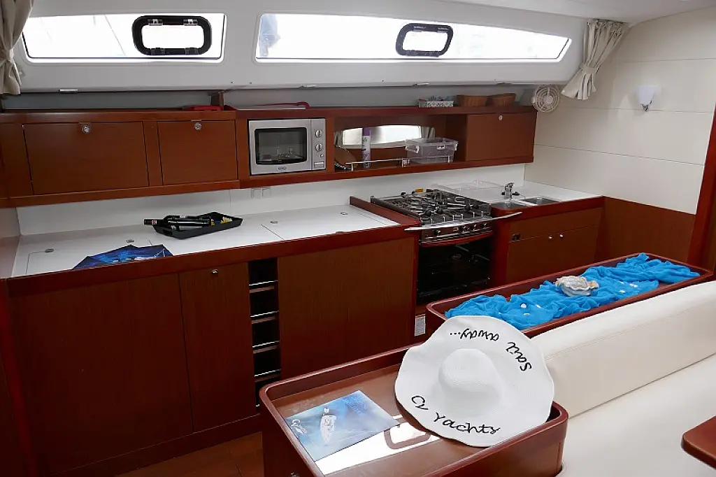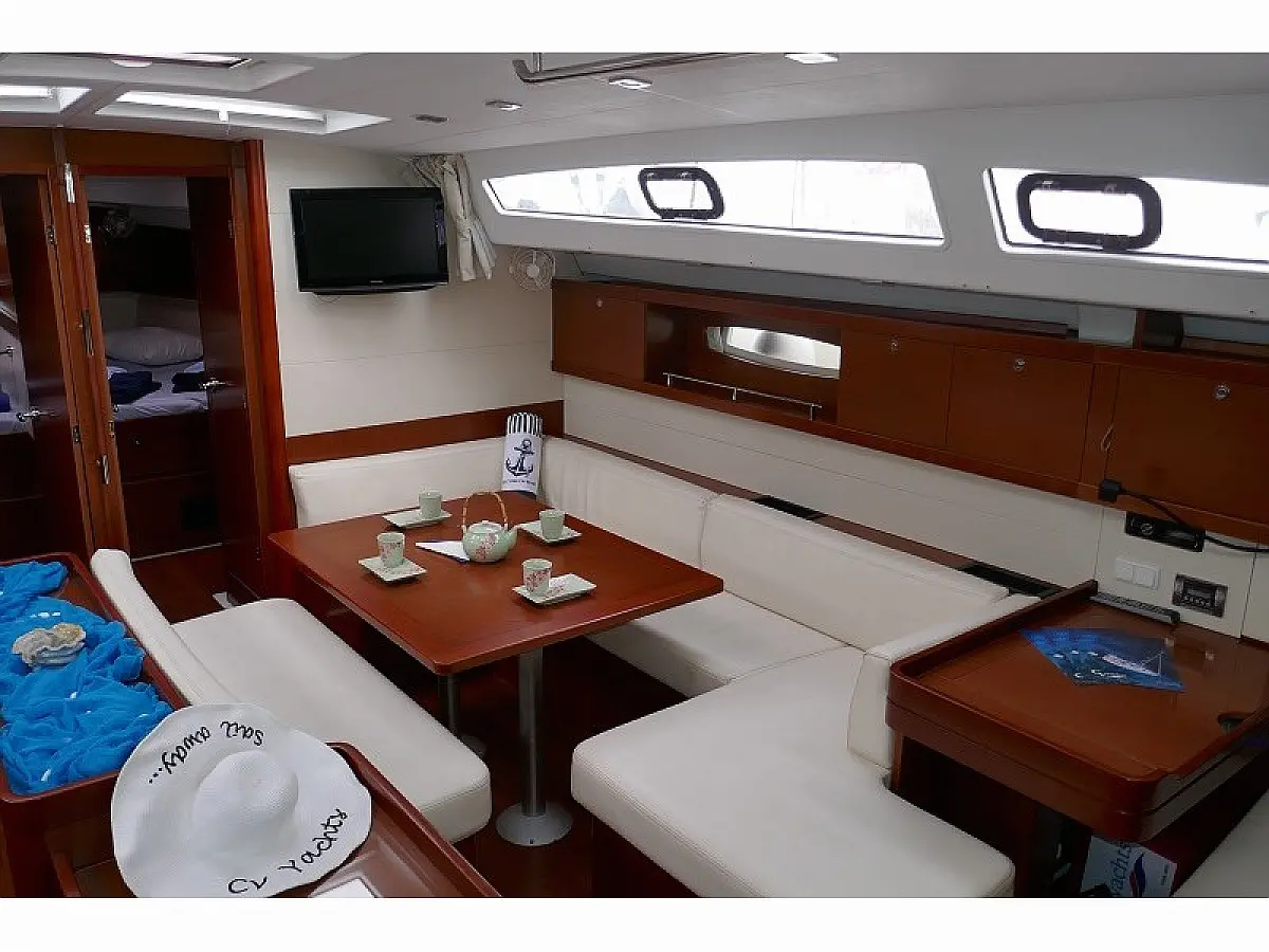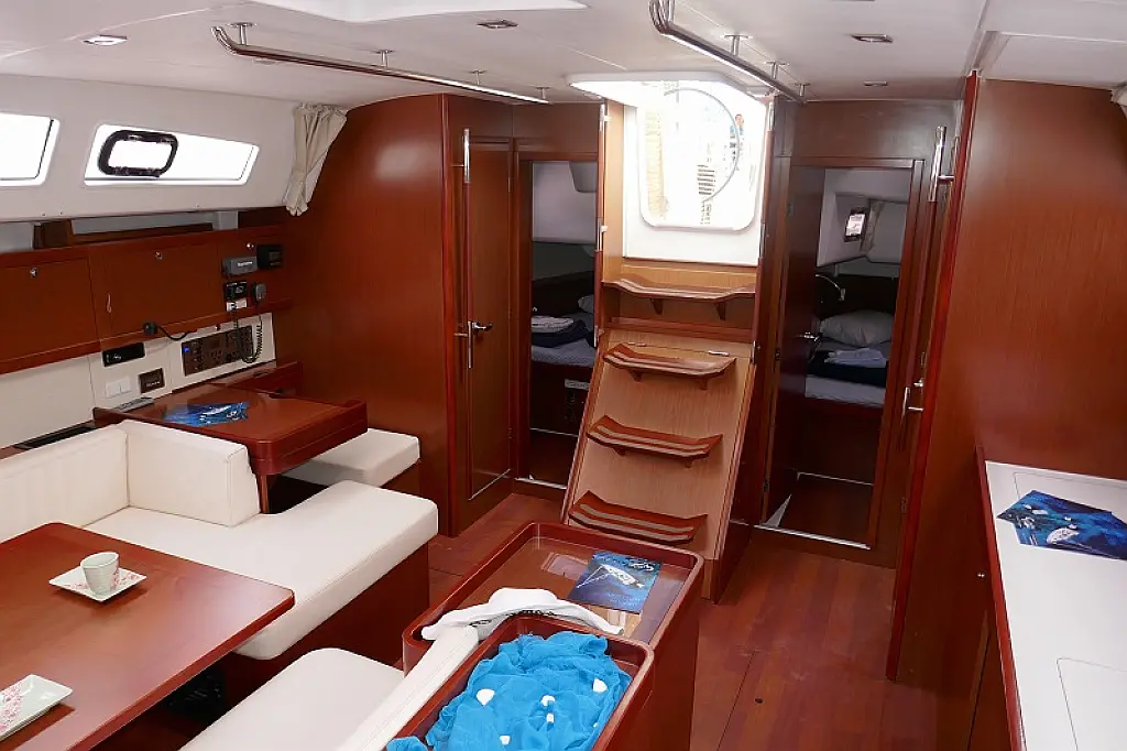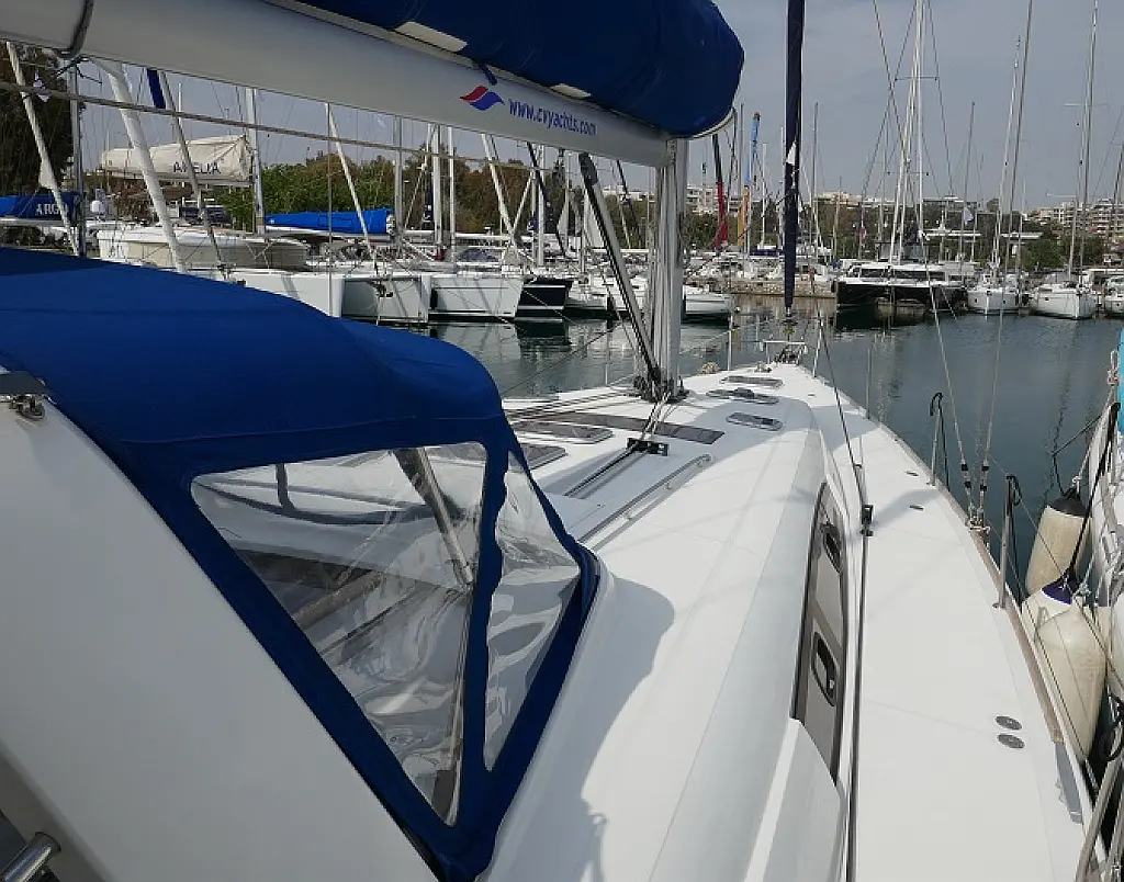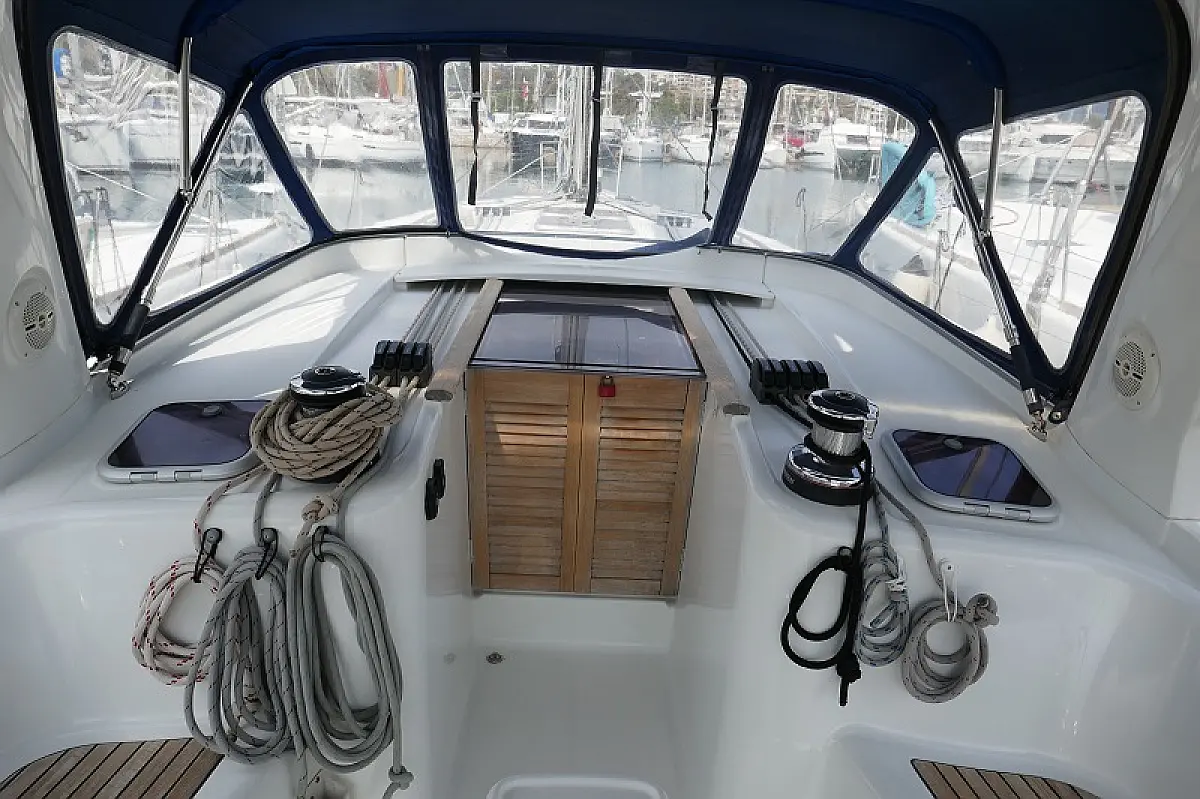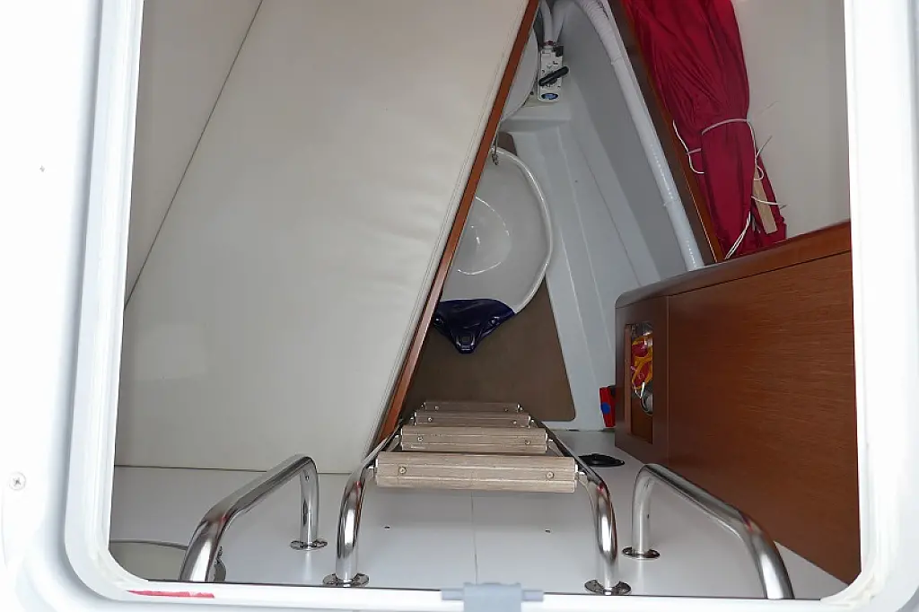 Convertable saloon table, Full batten main sail, Furling genoa, Lazy bag, Solar panels, Electric anchor windlass, Steering wheel (2), Generator, Air condition, Bimini top (Soft), Sprayhood, Electric fridge (2), Ice box, Autopilot, Wind instruments, Echo sounder, Speed log, GPS chartplotter, Battery charger, Inverter, 12 V plug, Electric winch (3), VHF, Bluetooth stereo, Bowthruster, Warm water, TV LED, Dinghy, Cockpit shower, Electric toilets (true), Holding tanks (5)