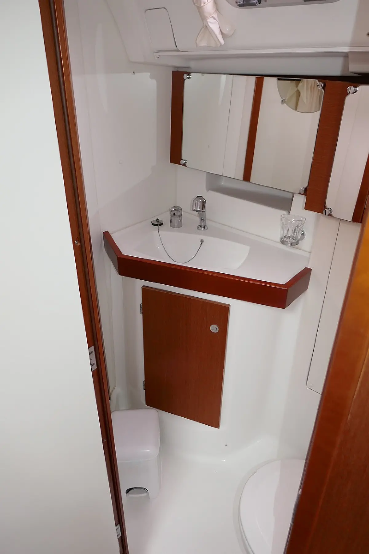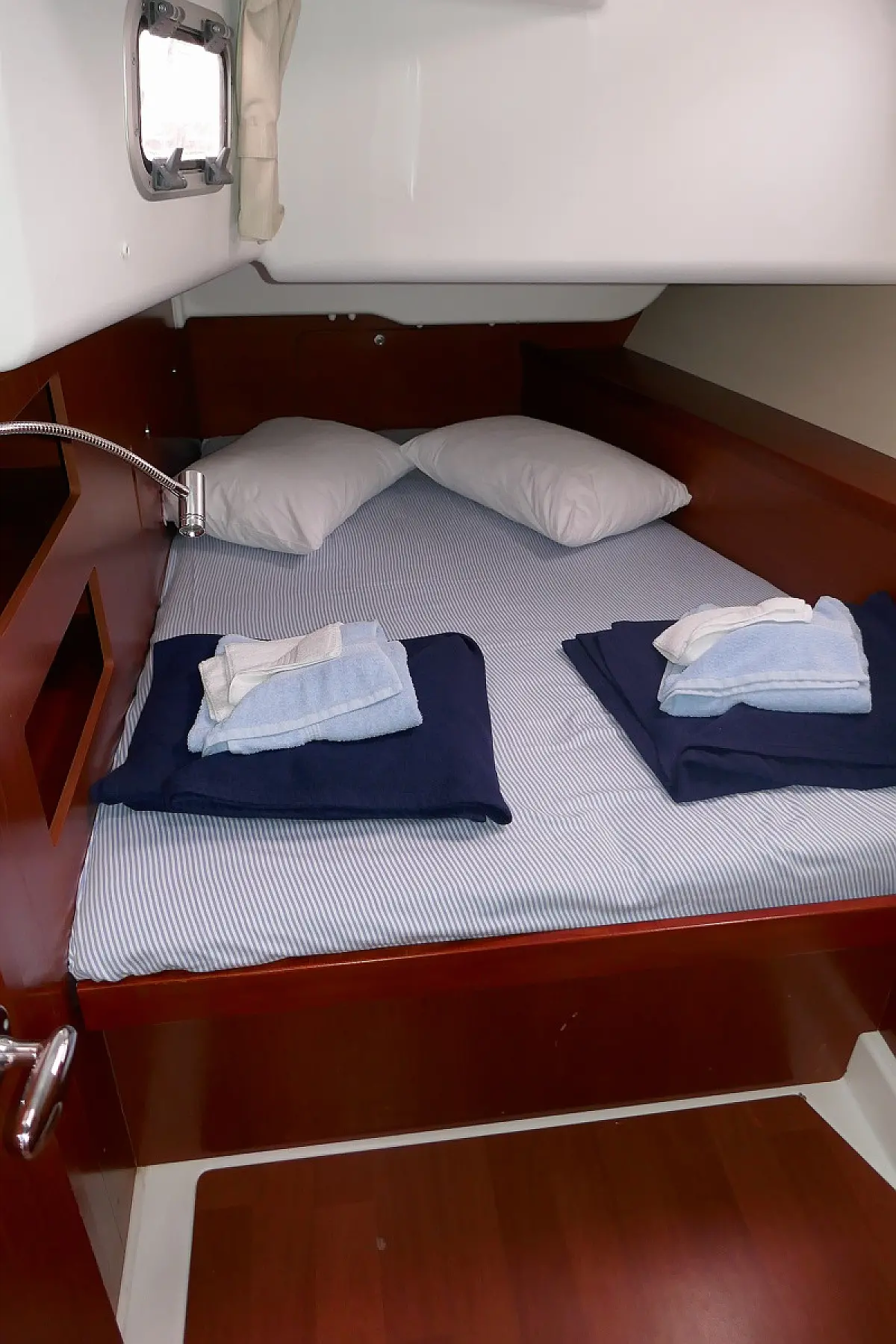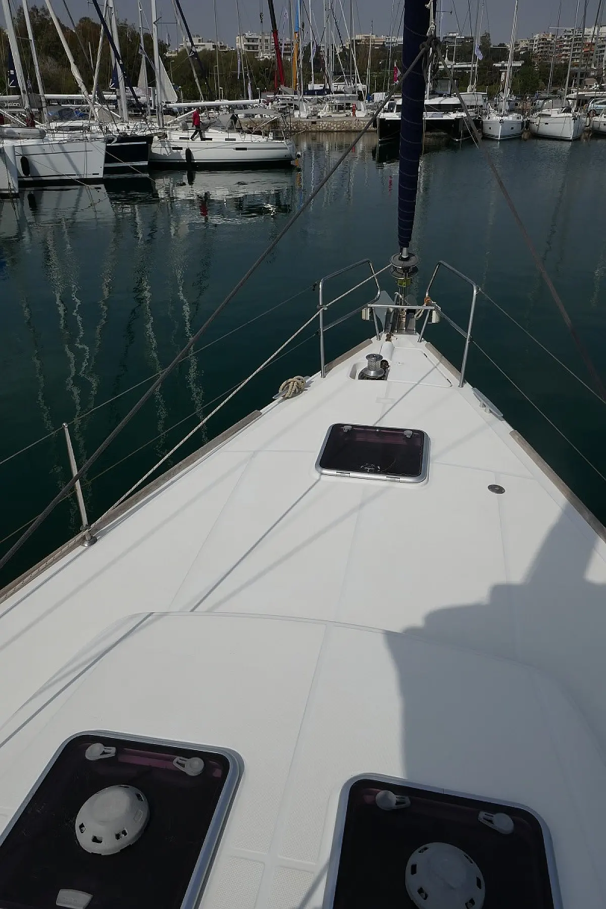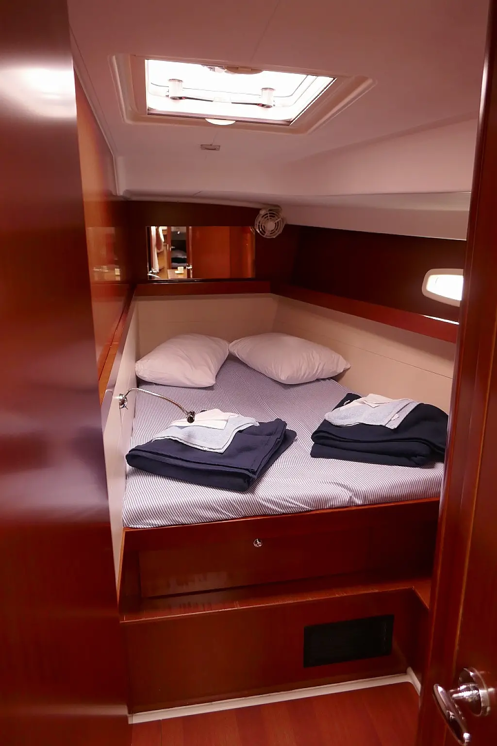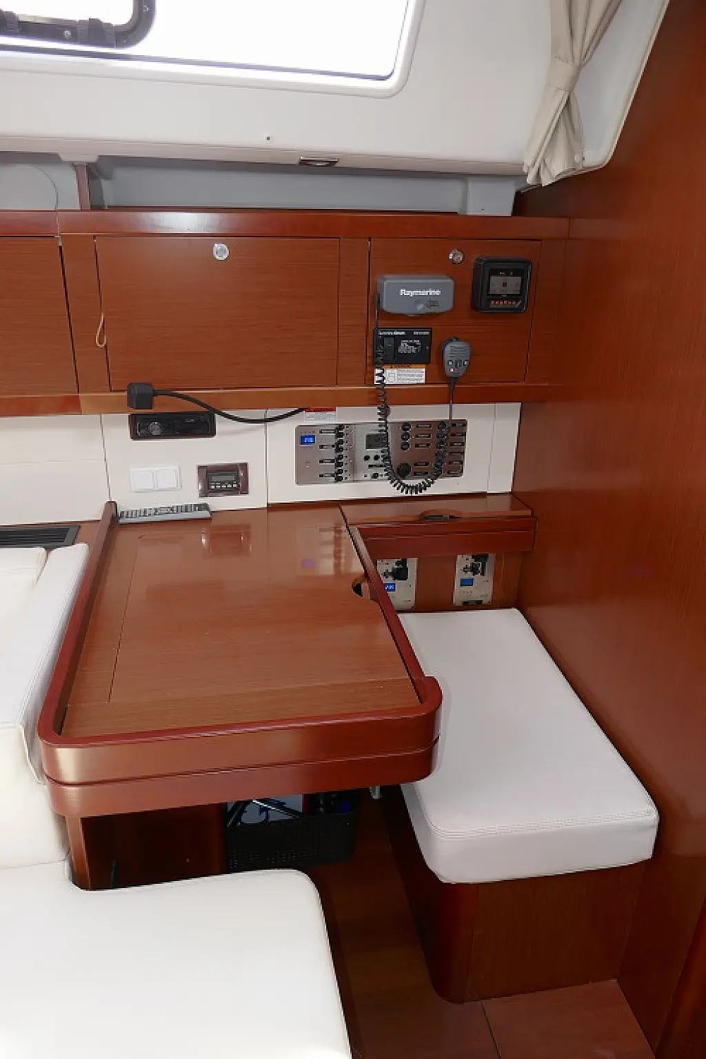 Convertable saloon table, Full batten main sail, Furling genoa, Lazy bag, Solar panels, Electric anchor windlass, Steering wheel (2), Generator, Air condition, Bimini top (Soft), Sprayhood, Electric fridge (2), Ice box, Autopilot, Wind instruments, Echo sounder, Speed log, GPS chartplotter, Battery charger, Inverter, 12 V plug, Electric winch (3), VHF, Bluetooth stereo, Bowthruster, Warm water, TV LED, Dinghy, Cockpit shower, Electric toilets (true), Holding tanks (5)