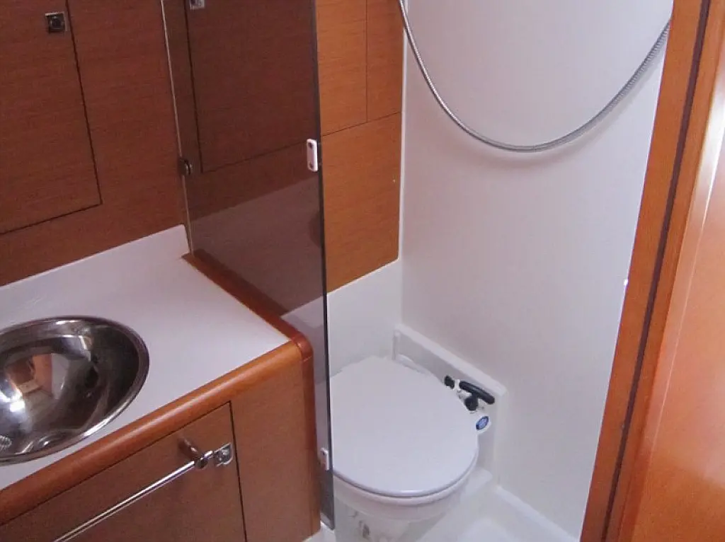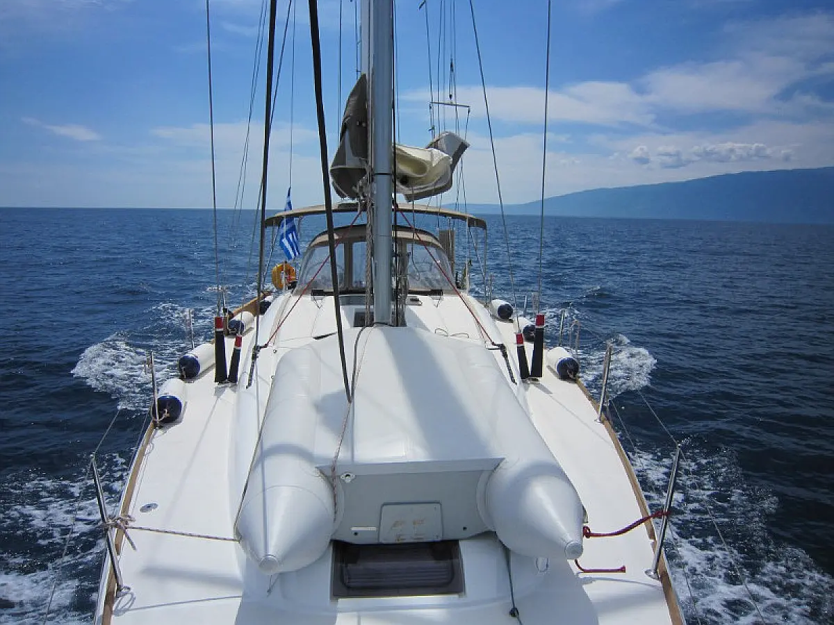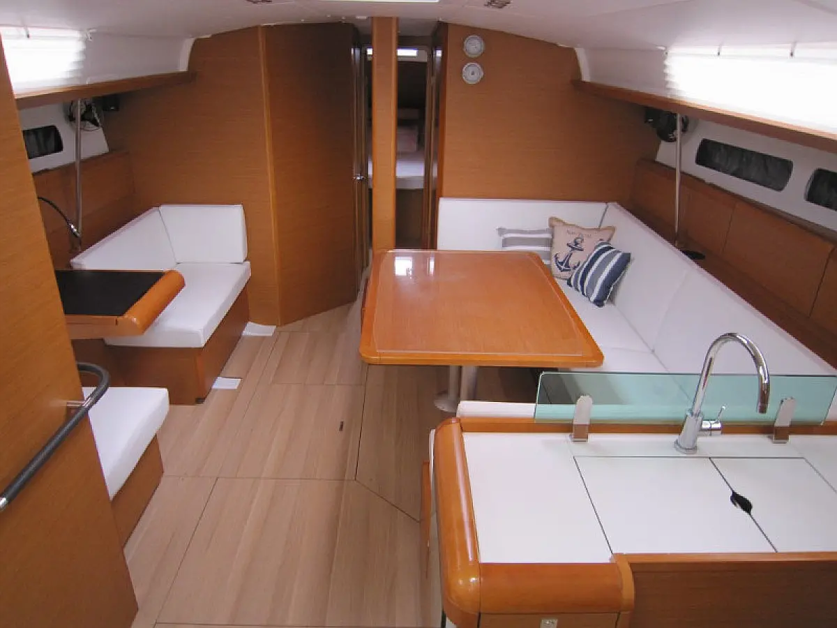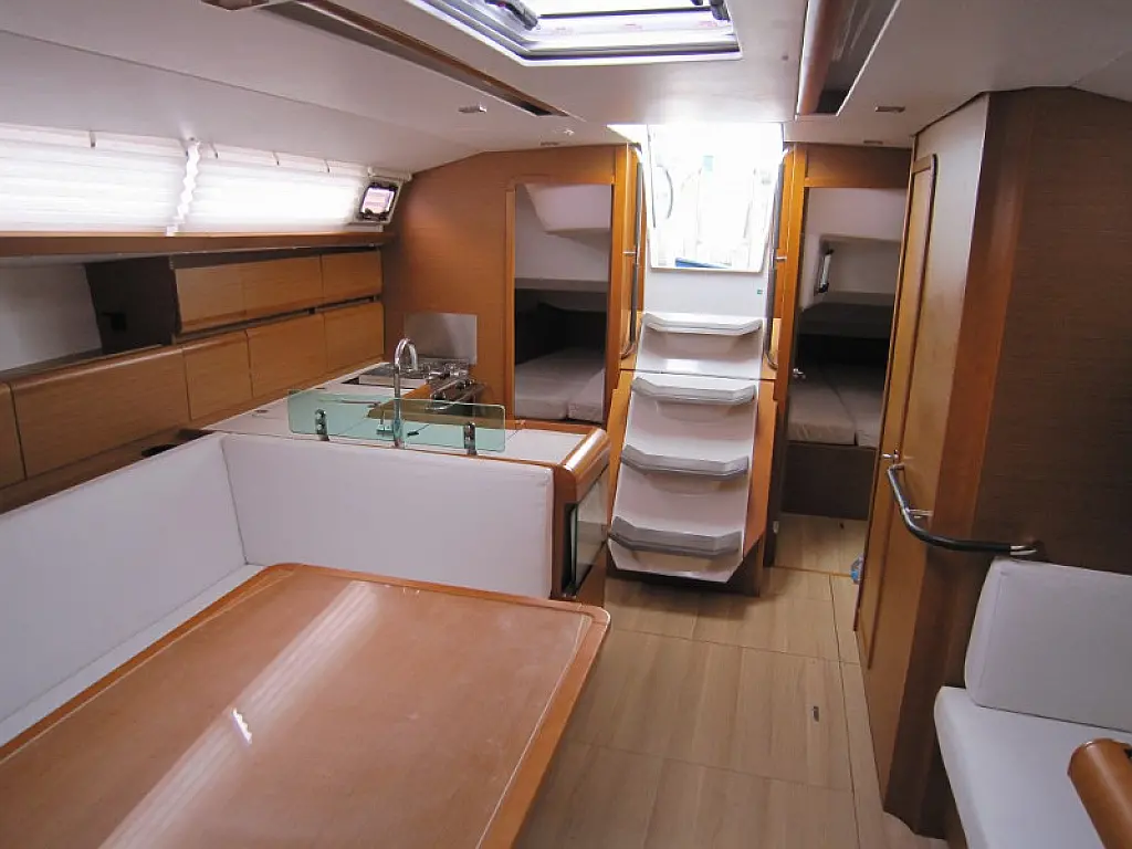 Convertable saloon table, Full batten main sail, Furling genoa, Lazy bag, Solar panels, Electric anchor windlass, Steering wheel (2), Air condition, Bimini top (Soft), Sprayhood, Electric fridge (1), Ice box, Autopilot, Wind instruments, Echo sounder, Speed log, GPS chartplotter, Battery charger, Inverter, 12 V plug, VHF, Bluetooth stereo, Bowthruster, Warm water, Dinghy, Cockpit shower, Holding tanks (1)