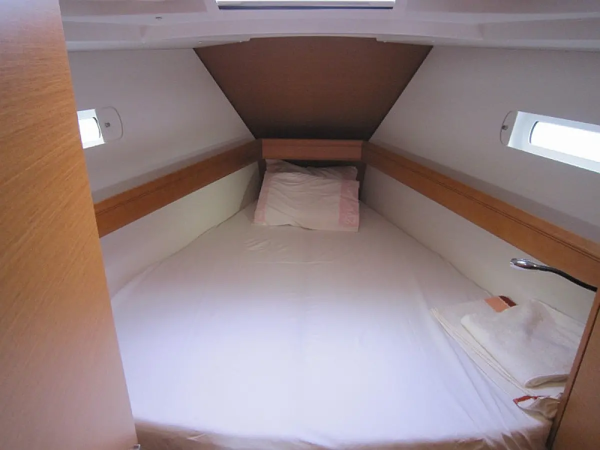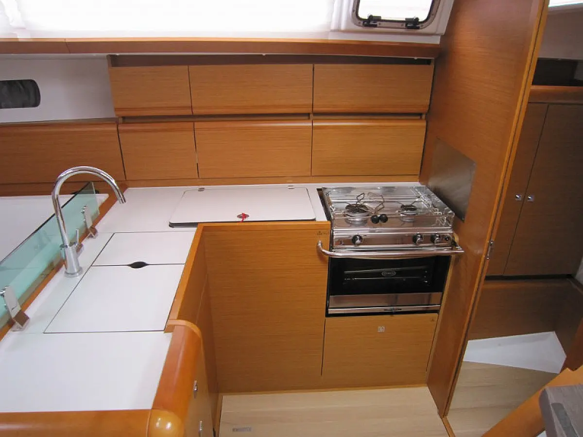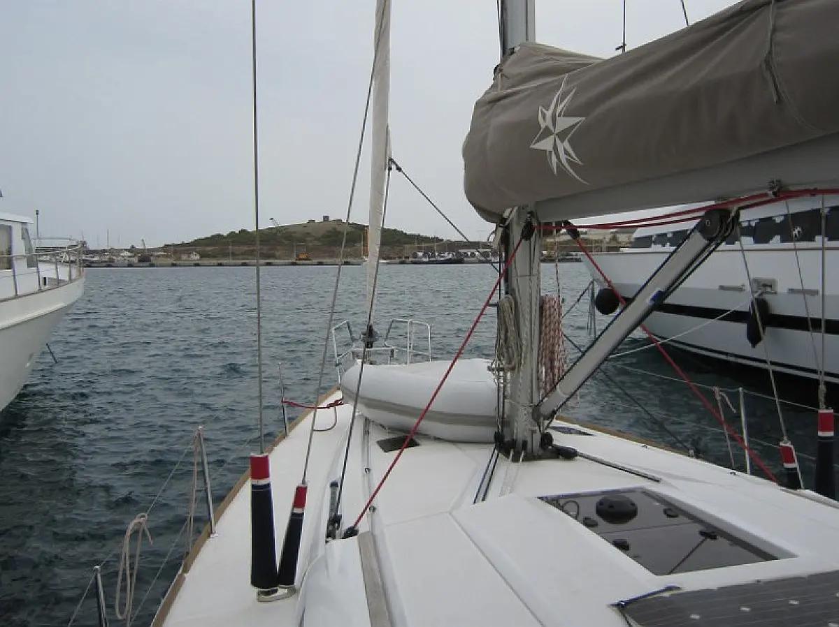 Convertable saloon table, Full batten main sail, Furling genoa, Lazy bag, Solar panels, Electric anchor windlass, Steering wheel (2), Air condition, Bimini top (Soft), Sprayhood, Electric fridge (1), Ice box, Autopilot, Wind instruments, Echo sounder, Speed log, GPS chartplotter, Battery charger, Inverter, 12 V plug, VHF, Bluetooth stereo, Bowthruster, Warm water, Dinghy, Cockpit shower, Holding tanks (1)